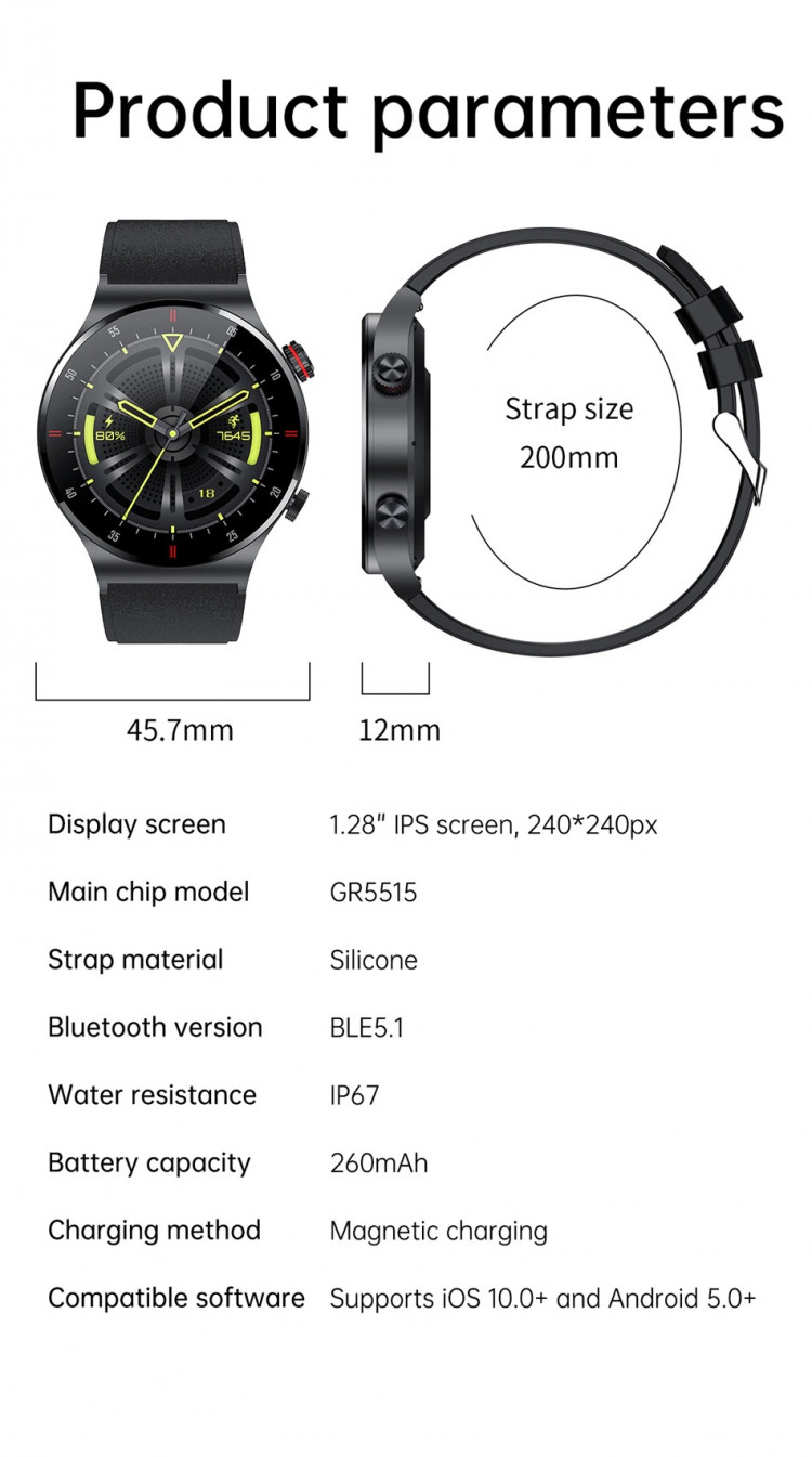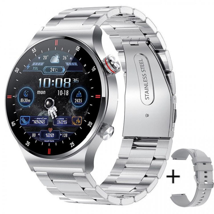 • Комплектація: годинник, два ремінці: сталевий та силіконовий (сірого кольору), кабель, коробка, інструкція.