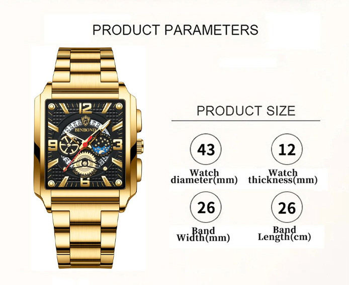 Чоловічий годинник BINBOND gold є розкішним придбанням і є не тільки інструментом для визначення часу, а й чудовим стильним аксесуаром.